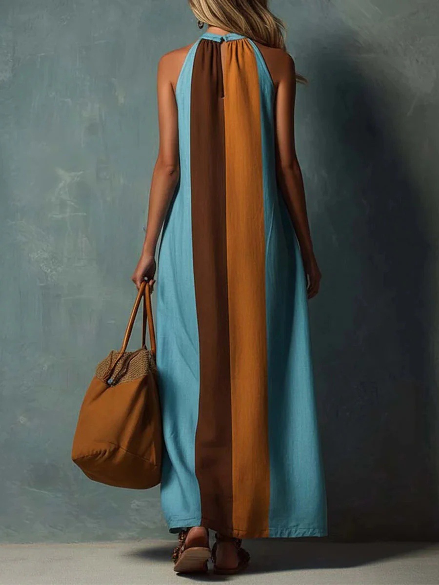Apportez une touche moderne et originale à votre garde-robe avec cette robe longue pour femme. Son design sans manches et son col suspendu apportent un style aérien et élégant, tandis que le contraste des couleurs (color-block) crée un look dynamique et contemporain.